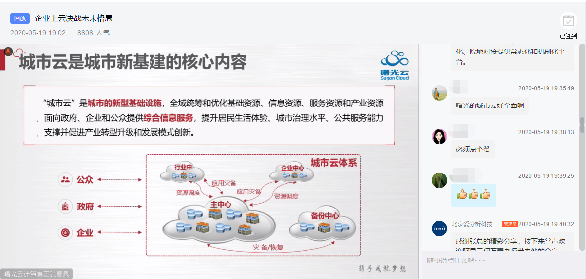 会上,张春泉明确了曙光云在“新基建”机遇下的发展脉络。他介绍说,新基建提出的大数据中心与传统数据中心相比,技术上要标准化、模块化、高密度、绿色节能,要具备云平台和大数据平台的支撑能力。在大数据中心方面,曙光云未来将以城市云数据中心为主要载体,通过数据全面融合城市业务,支撑城市稳定有序运行,提升城市居民智慧生活体验、城市治理水平、公共服务能力,支撑并促进产业结构升级和发展模式创新。