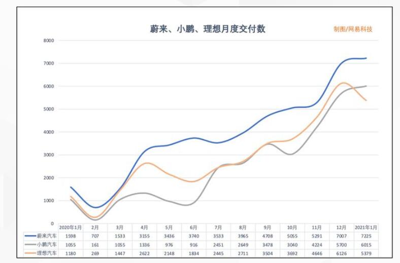 从交付数据来看,蔚来1月份交付数7225台,环比增长了3%,这比2020年末12月份324%的环比增长,相差甚远。