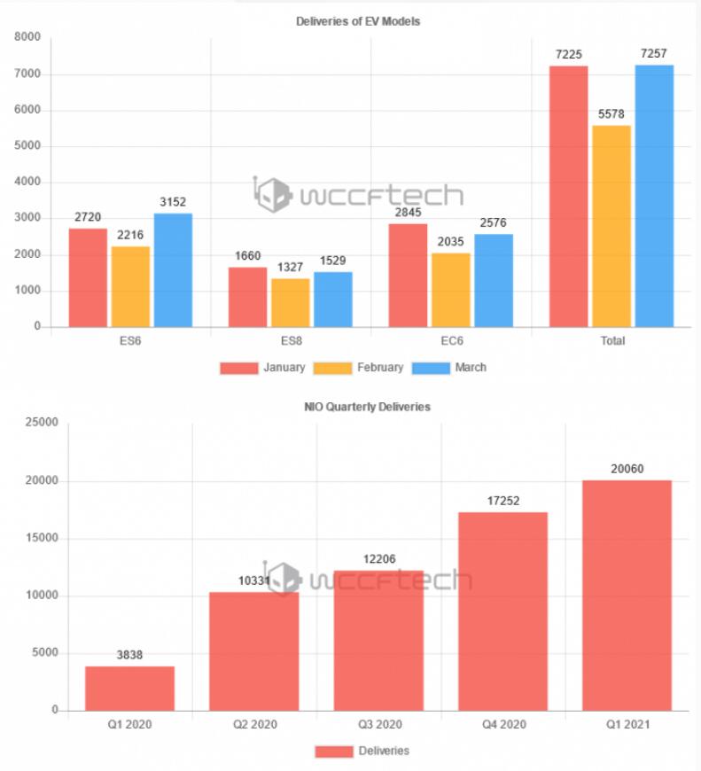 数据显示,蔚来汽车在2021年第一季度交付了20,060辆汽车,创下了新的季度记录,同比增长423%。截至2021年3月31日,ES8,ES6和EC6的累计交付量达到95,701辆。