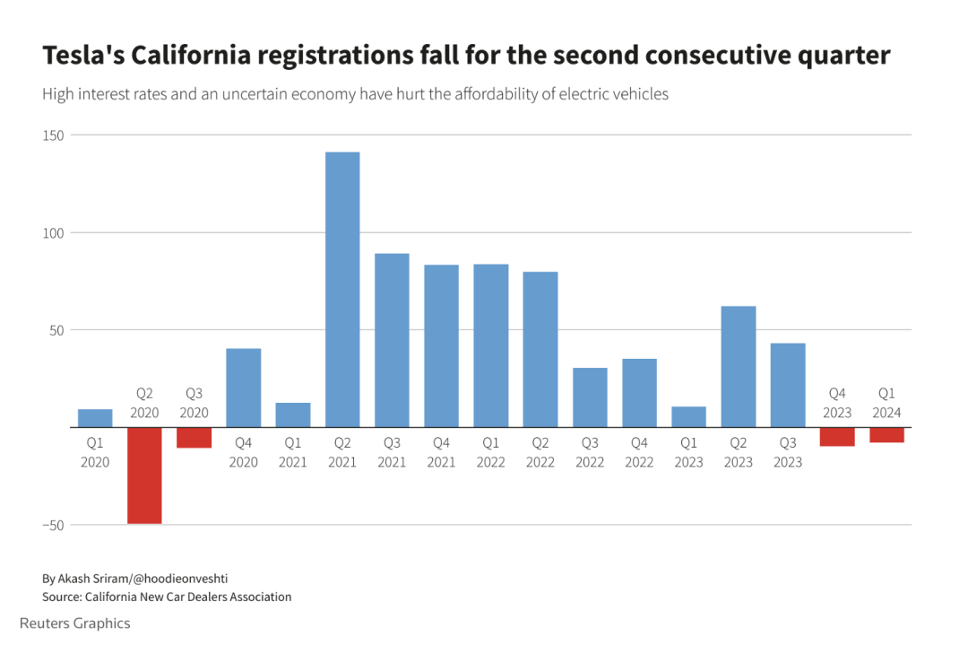 一方面是加州电动车需求降温,另一方面是特斯拉销量下滑。今年第一季度,电动车在加州的市场渗透率从上年同期的21.2%下滑到20.9%。而特斯拉在加州电动车市场的占有率下滑了6.4个百分点,降至55.4%。