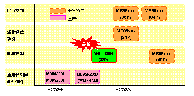 富士通微电子预计从2010年3月下旬开始提供MB95330H系列样片,样片价格为1美元。预计此产品2010年度将可达到三百万颗的销售目标。