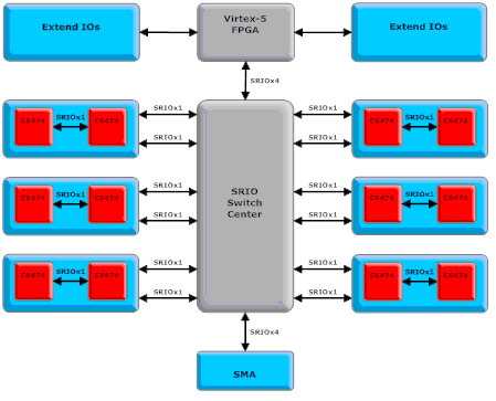 芯片互联,启动同步以及多内核通信和管理是多处理器系统设计所面临的最大挑战,AVST的这款开发平台选择了SRIO总线做为多处理器之间的物理互联方式,这是一种高性能的多处理器互联方式,1x模式下可以用很少的IO资源提供理论峰值高达3.125Gbps的传输带宽。该平台选用了一颗高性能的SRIO交换芯片作为12颗DSP处理器和1颗FPGA芯片的数据交换中心,可以支持12路1x的SRIO链接和2个4x的SRIO数据链接。同时,借助TI公司的CCS集成开发环境和DSP BIOS实时内核,可以高效的完成对三核心DSP程序的精确仿真和调试工作。