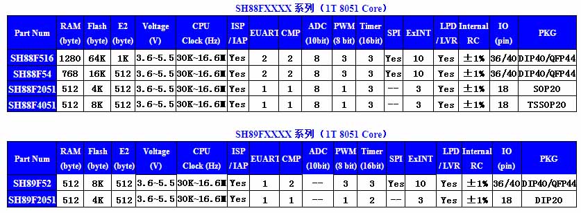 2010-06-01 11:24:52 本站原创中颖电子新近推出SH88/89系列1T 8051单片机,跟目前市场上流行的ATMEL、STC、SyncMOS、Winbond等的GP8051管脚完全兼容,且功能更多,性价比更高。