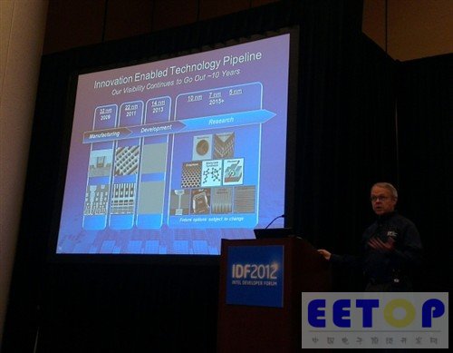 2012-09-17 19:45:13 本站原创在本届IDF2012秋季大会上,Intel高管Mark Bohr向与会的记着和专家们重点阐述了Intel在过去几年以及未来几年在制成工艺上的总结和展望。从公布的PPT来看,Intel明年将会上 14nm,2015年以后,Intel将会陆续引入10nm、7nm和5nm工艺。