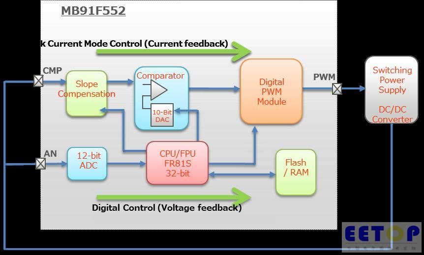 MB91F552集成了比较器和斜坡补偿电路,可以支持峰值电流模式控制。该方法除了进行数字控制外,还控制DC/DC转换器和其它开关型电源。
