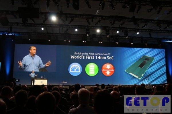 2013-09-12 13:17:06 本站原创就在大多数目光都聚集在苹果总部的时候,英特尔在IDF 2013大会的主题演讲上正式带来了下一代的14nm制程的Broadwell处理器(SoC)。英特尔新任首席执行官科再奇(Brian Krzanich)在舞台上展示了搭载下一代Boardwell处理器的笔记本电脑工程机,并称新的处理器可以将续航性能提升30%,而这还仅仅是目前测试环节中的进展,言外之意,采用14nm制程的Broadwell处理器在续航时间方面或许还有更大的提升空间。