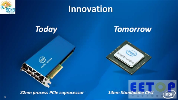 2013-11-22 18:59:26 本站原创Xeon Phi协处理器在超级计算机领域崭露头角,与中国合作的天河二号继续霸占全球No.1宝座,Intel近日又披露了 下一代产品“Knights Landing”的更多技术细节,进步之大令人震惊。现在的Xeon Phi只是协处理器,需要做成PCI-E扩展卡的样式,搭配Xeon E6-2600/v2系列中央处理器才能运作,只是起到加速作用。