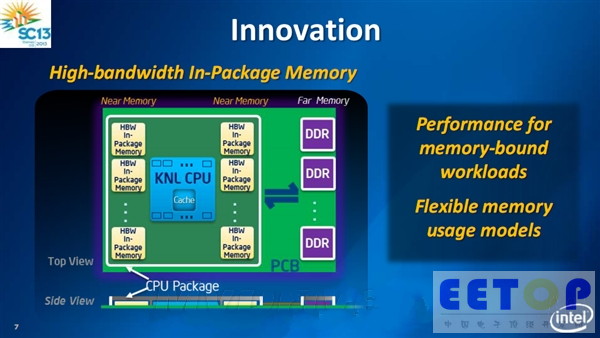 Knights Landing的主处理器版本会在内部整合封装高带宽的内存缓冲(胶水式而非原生),再搭配外部的DDR3、DDR4内存,将极大地提升内存密集型应用的性能。