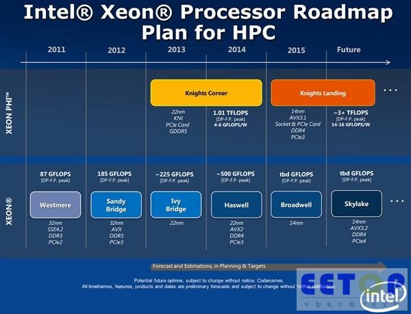 根据今年早些时候泄露的一张幻灯片,Knights Landing将在2015年初发布,支持AVX 3.1指令集、DDR4内存、PCI-E 3.0总线。