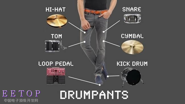 DrumPants是一款能在裤子上敲击爵士鼓的可穿戴音乐设备。它佩戴轻松方便,只需将两个传感器带绑在腿部,再将鞋垫放入鞋子内,连接控制器后,身体就能变成万能的乐器,通过拍打腿部或轻轻跺脚就能随时随地创作和播放音乐。它的功能远远超出了你的想象,DrumPants配套的控制器通过简单编程可以实现 150多种内置的声音,包括鼓、吉他、钢琴、小提琴等。任何音乐爱好者和创作家都无法拒绝这样的疯狂与自由。