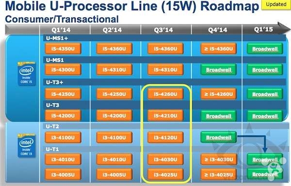 目前苹果 MBA 入门级机型使用的是 1.3 GHz i5-4250U 芯片,而高端机型使用的是 1.7 GHz i7-4650U 芯片。这两款芯片都使用 Iris 5000 的集成显卡。根据曝光的产品路线图,入门级芯片的更新将会在第三季度发布,为 i5-4260U Haswell 更新,与目前的芯片相比它只是在速度上有小幅提升。当然苹果可以选择使用 1.4 GHz i5-4350U 或 1.5 GHz i5-4360U 芯片,但是前者是去年的产品,苹果并没有选择使用在 MBA 上。高端 MBA 的情况更加不明朗,因为我们在线路图上没有看到现役 i7-4650U 的后续产品更新。
