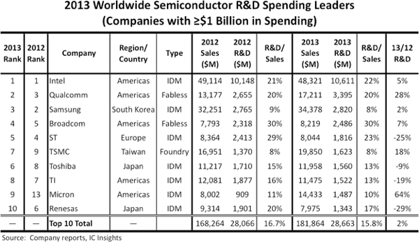 美光是进步最明显的,2013年研发支出猛增了64%而达到了14.87亿美元,从第13名窜升至第9。