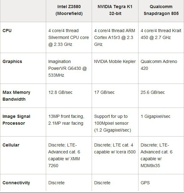 在下面表格中,我对Moorefield、高通骁龙805、英伟达Tegra K1的各项性能进行了分析。