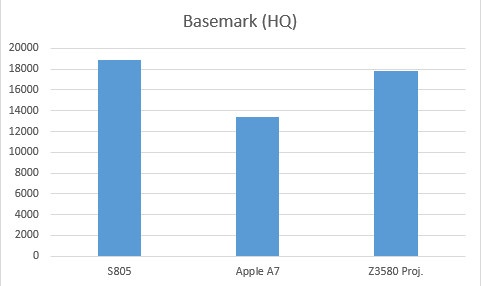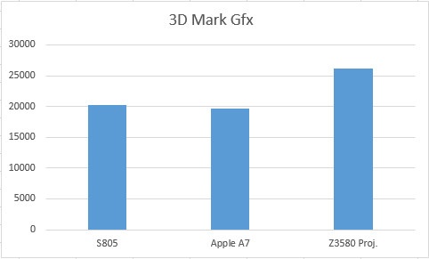 在3DMark Unlimited测试中,Z3580性能遥遥领先,A7的表现优于骁龙805。