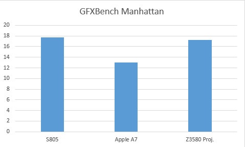 在GFXBench Manhattan测试中,骁龙805的性能再次超越A7或Z3580。