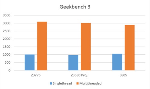 尽管骁龙805性能应当领先于Z3580,如果只考虑CPU性能,两者的位置可能互换。在Geekbench 3测试中,英特尔Bay Trail(集成有4个时钟频率为2.39GHz的Silvermont CPU内核)性能超过骁龙805。Silvermont和Krait的性能差距相当小。