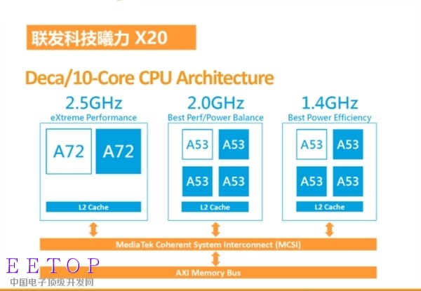 最后我们要提的就是全球第一款十核芯片MT6797,也就是我们熟知的Helio X20,它创新地采用了一种三丛集(Tri-Cluster)的架构设计,包含两个负责展现最高性能的2.3-2.5GHz A72核心、四个平衡性能与功耗的2.0GHz A53核心、四个负责低负载任务和节能省电的1.4GHz A53核心一共十核,为此还特地研发了一套用于互联的总线系统,以20nm的新制程制造。GPU部分更换了ARM家最强的Mali-T880MP4,性能比MT6595提升最多40%、功耗降低最多40%。目前市面上很多热销的手机就是采用这款芯片,如魅族MX6、乐视2代等等。