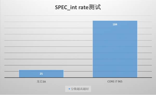 接着是多线程测试SPEC_int rate。计算所只提供了四核心版本的龙芯3A的多核测试分数,我们找到了一款老版四核i7 965 3.2G的成绩来做比较。