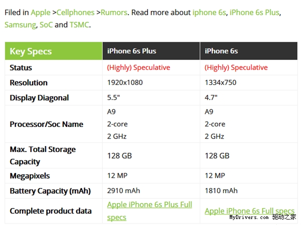 以下是外媒总结的iPhone 6s、iPhone 6s Plus的传闻配置: