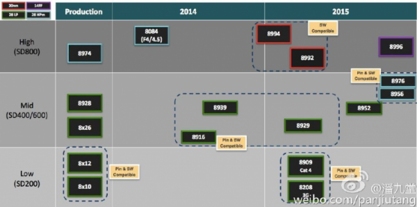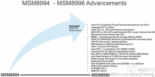 从上图可以看出,骁龙820(MSM8996)确定采用的是14nm工艺,那么基本可以排除台积电,将由三星的14nm FinFET工艺代工。另外,骁龙820还将采用全新基带,支持LTE Cat.10标准,下载峰值速度450Mbps,这与海思麒麟950一致;双通道LPDDR4-1866内存,GPU为高性能低功耗Adreno 530(性能提高40%,功耗降低30%)。