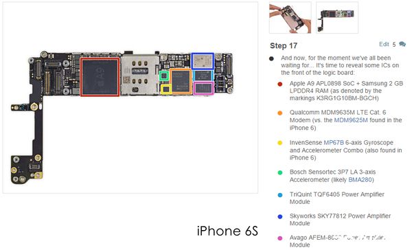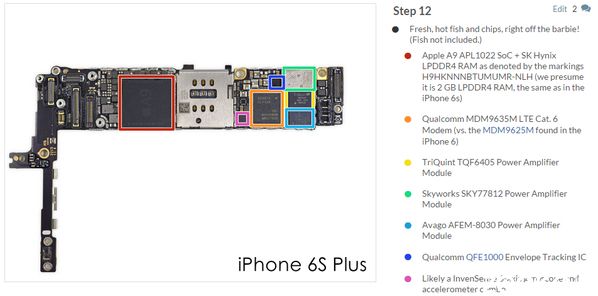 在 iFixit 的拆解示意图中可以清楚的看到,iPhone 6s 的 A9 处理器型号为“APL0898”,而 iPhone 6s Plus 的则为“APL1022”。处理器型号不同所使用的内存也不同,APL0898 搭配的是三星提供的 LPDDR4 2GB RAM,APL1022 则是海力士提供的 LPDDR4 2GB RAM。
