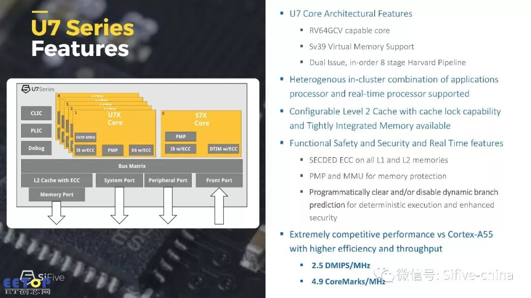 E7 Core IP系列包括32位E76和E76 -MC,并提供硬实时功能。 SiFive Core IP S7系列通过S76和S76 -MC为嵌入式市场带来了高性能的64位架构。 SiFive核 Core IP U7系列是一款支持Linux的应用处理器,具有高度可配置的存储器架构,可用于特定领域的定制。与所有SiFive U内核一样,64位U74和U74-MC完全支持Linux,而E76、E76-MC、S76和S76-MC则支持裸机环境和实时操作系统。所有新内核均提供高效的性能和优化的功耗,适用于减轻数据中心的载荷并且支持超强节能的端侧设备。 U74-MC为实时、延迟敏感的应用提供64位寻址能力,例如5G基带处理,用于快速或大数据的企业级存储以及用于AR / VR / SLAM应用的多模式传感器融合。