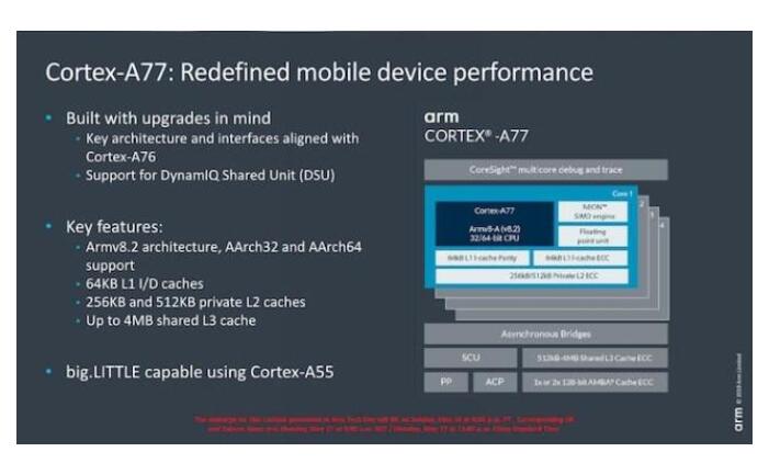 从参数来看,Cortex-A77 与 Cortex-A76 采用了同样的架构——Armv8.2,支持 AArch32 和 AArch64,支持 DynamIQ Shared Unit(DSU),支持 big.LITTLE 架构,可以与 Cortex-A55 相搭配。