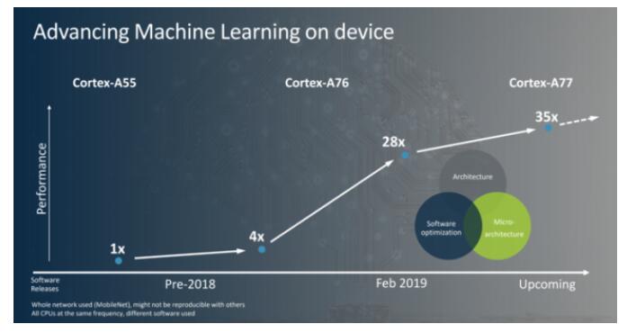 在性能表现上,与 Cortex-A76 相比,Cortex-A77 的 IPC 表现提升了 20%。不过,ARM 更为强调的点在于机器学习,在软硬件的协同优化,Cortex-A77 在机器学习方面的表现是 Cortex-A55 的 35 倍。
