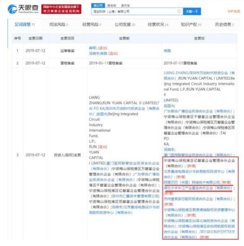2019-07-16 09:23:09 快科技腾讯科技讯 天眼查数据显示,7月12日,恒玄科技(上海)有限公司发生多项工商变更,其中新增7位股东,包括阿里巴巴(中国)网络技术有限公司、湖北小米长江产业基金合伙企业(有限合伙)等7家公司。其中,湖北小米长江产业基金合伙企业(有限合伙)由小米与长江产业基金共同成立,小米科技有限责任公司持股17.2265%。同时该公司增为汤晓冬董事,注册资本由1000万元增长至1083.33万元。