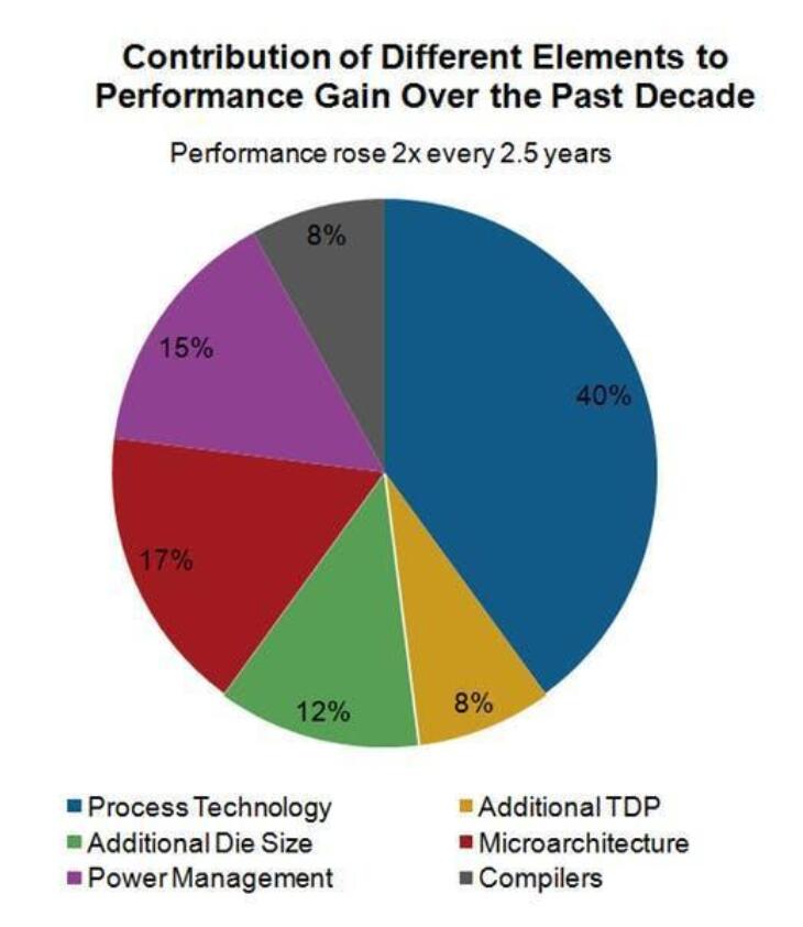 先进工艺制程的贡献最大,这使得CPU的性能提升了40%。增加芯片尺寸也可以带来两位数性能的提升,但这不符合成本效益。