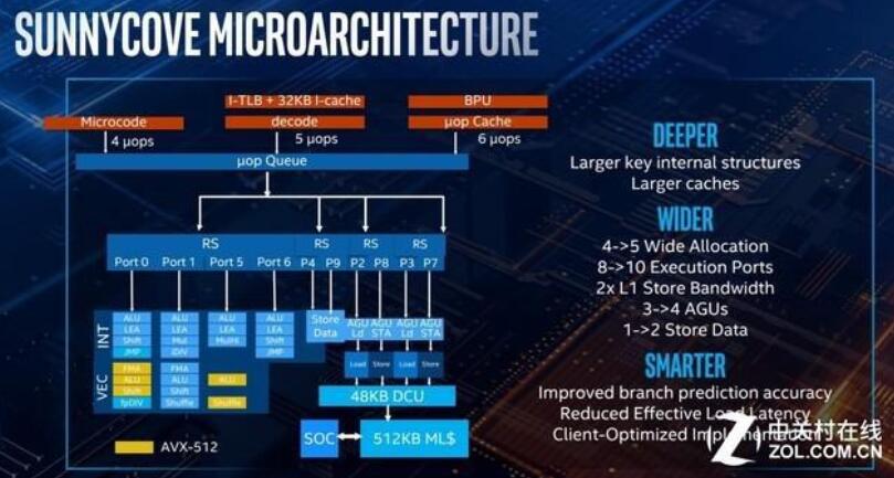 更深方面,Sunny Cove微架构表现在L1容量的增加,从32KB增加到48KB,而且L2缓存、uop、TLB缓存都更大;