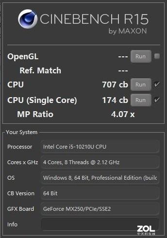 英特尔酷睿i5 10210U Cinebench R15跑分