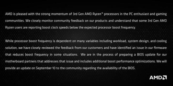 PC发烧友、游戏玩家对于第三代AMD锐龙处理器的强烈追捧,AMD感到非常兴奋。我们一直在密切关注用户对我们产品的反馈,并已知晓部分第三代锐龙处理器的加速频率低于预期。