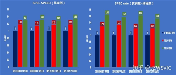 对比单核睿频3.9GHz、全核睿频3.5GHz的Ice Lake十代家族旗舰i7-1065G7,新U的Spec06/17单实例性能提升了15-18%,多实例性能则提升了22-32%,可以粗略地理解为单线程、多线程性能的变化。