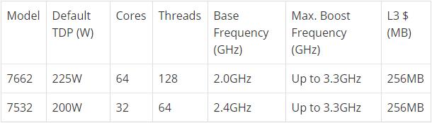 通用属性方面,EPYC 7662 和 EPYC 7532 都支持 128 条 PCIe 4.0 通道、3200MHz 内存、以及高级安全特性。