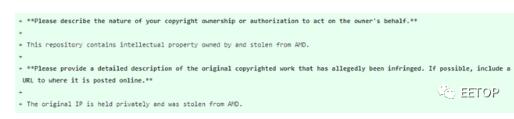 在发给 Github 的 DMCA 通知中,AMD 将最近创建的“ xxXsoullessXxx”存储库和“ AMD-navi-GPU-HARDWARE-SOURCE”的项目标识为 AMD 被盗的知识产权。AMD 表示,这些存储库的知识产权归 AMD 所有,存储库资源是从 AMD 盗取的。