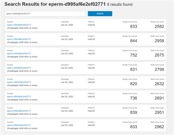 很显然,开发者们已经迫不及待地上手,GeekBench 5数据库里就出现了Apple Silicon的第一批跑分成绩:单核心736-844、多核心2582-2962。