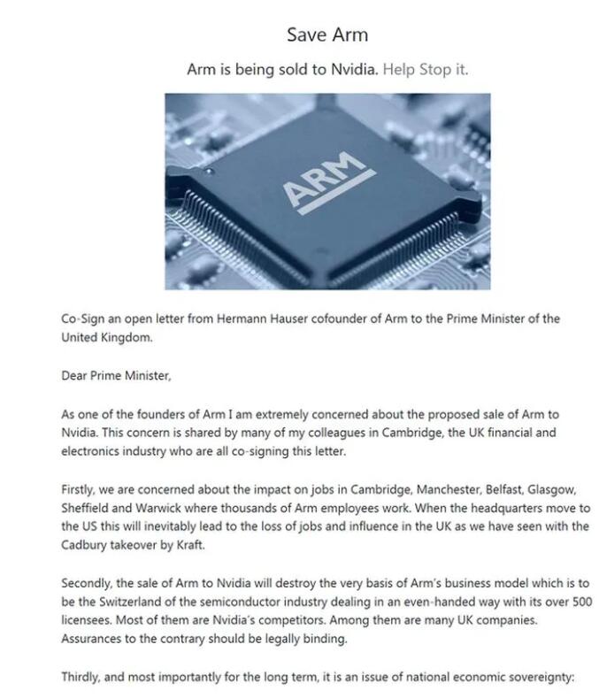 作为arm的创始人之一,我(指代本文作者Hermann Hauser)非常关注Arm出售给英伟达这个交易,而这封信则是我在剑桥的同事和英国的金融和电子产业的人共同签署的。