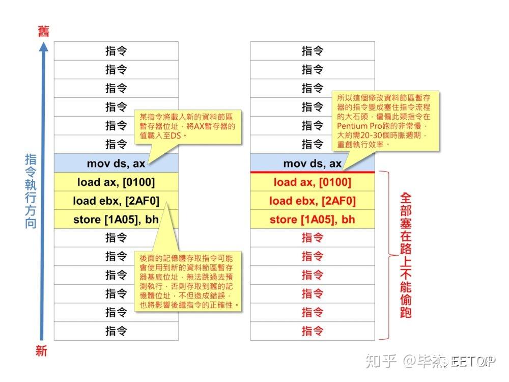 为何「位址计算单元」一向是历代x86 处理器增加执行单元的重头戏,原因就在此。Windows 95 刺激个人电脑普及的年代,「32 位元最佳化」的Pentium Pro 被批评「16 位元效能不佳」就因动到数据节区寄存器的指令,无法被非循序预测执行,会让随后的指令上演大塞车,到了Pentium II 才修正。即使假以时日,这些老旧包袱的使用率只会越来越低,也早不再是改善效能的重点,但也没人胆敢冒着牺牲软件兼容性的风险,根除这些历史遗迹。