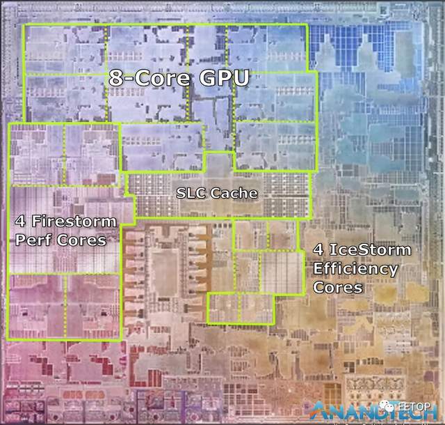 8核GPU占用了大量的裸片空间,位于该裸片的上部。