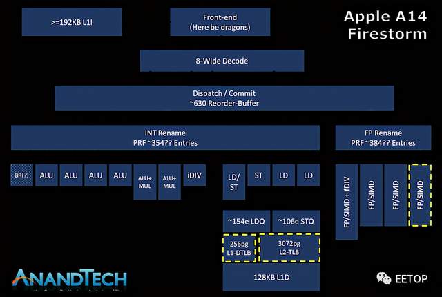 上图是苹果最新的大核设计的估计功能布局--这里所代表的是我们在确定新设计功能方面的最大努力尝试,但肯定不是对苹果设计的所有功能的详尽钻研--所以自然可能存在一些不准确的地方。