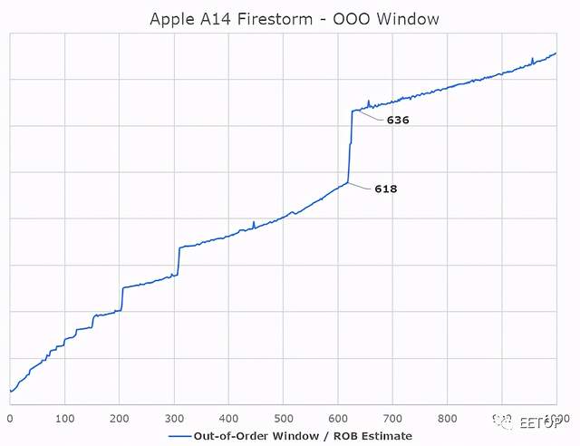 苹果最近的设计中,有一个我们从未真正能够具体回答的问题是,苹果的乱序执行能力有多强。Firestorm的ROB在630指令范围内,这是去年A13闪电核心的升级,它在560指令范围内测量。目前还不清楚这是否与其他架构中的传统ROB相同,但测试至少暴露了与ROB相关的微架构限制,并暴露了行业中其他设计的正确数据。乱序窗口是指当内核试图获取并执行每条指令的依赖关系时,内核可以“停放”的、等待执行的指令数量。