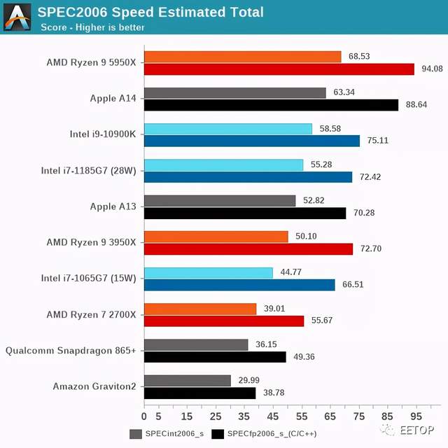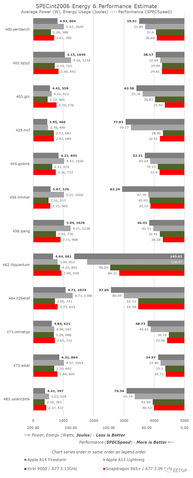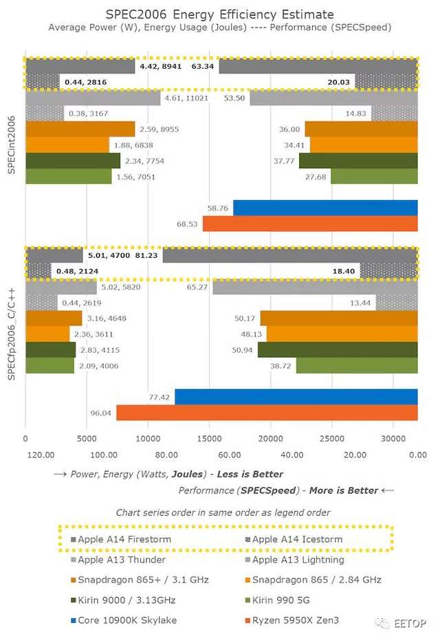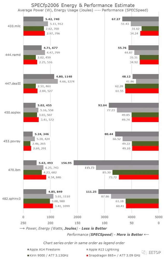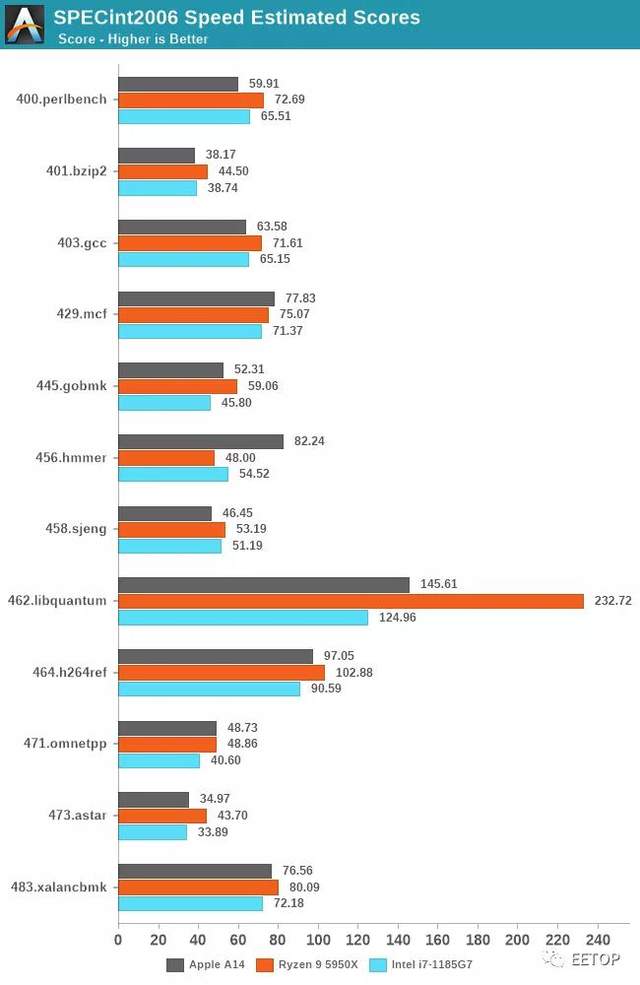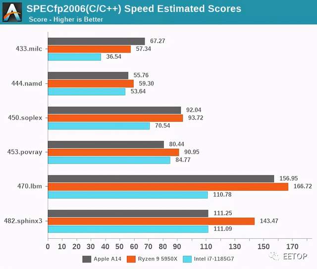 在总体SPEC2006图表中,A14表现绝对出色,在绝对性能上领先,只是低于AMD最近的Ryzen5000系列。