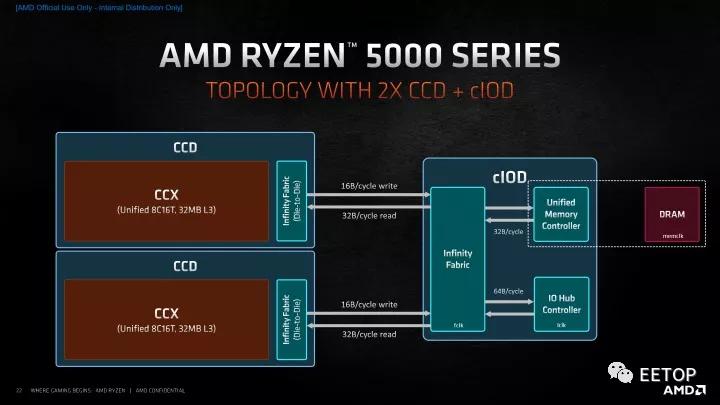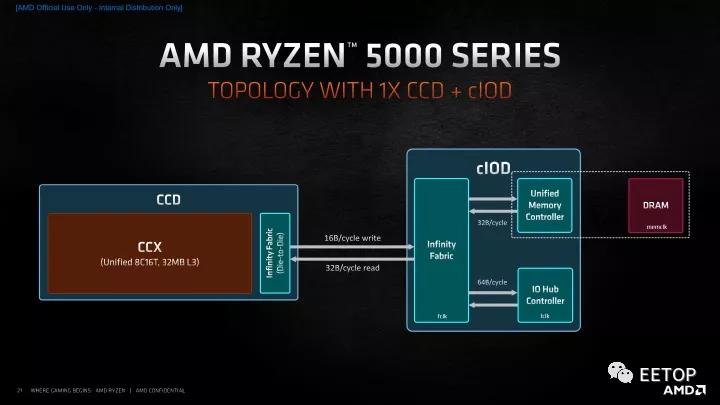 ▲以8核心的Ryzen 5000系列处理器为例,处理器封装中包含CCD(其中有1组CCX)与IOD各1组。