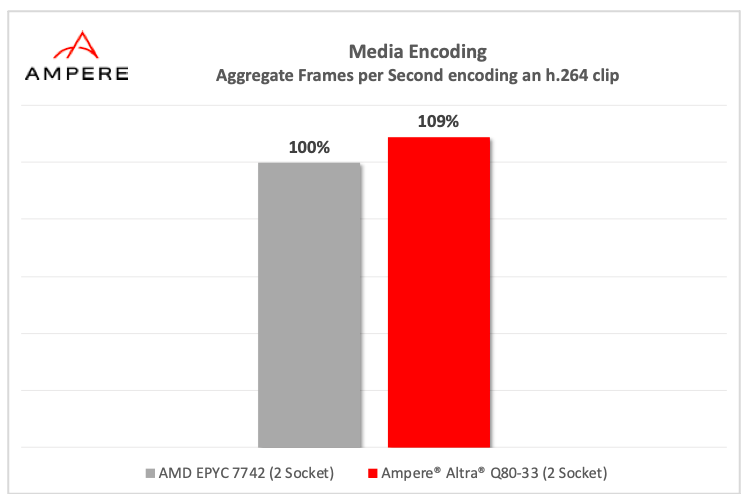 测试结果表明,Ampere Altra Max每秒编码帧数比Ampere Altra高出55%。而过往的测试显示,Ampere Altra的编码性能已经领先于当前的x86处理器(如图2所示),Ampere Altra Max则比Ampere Altra更强。