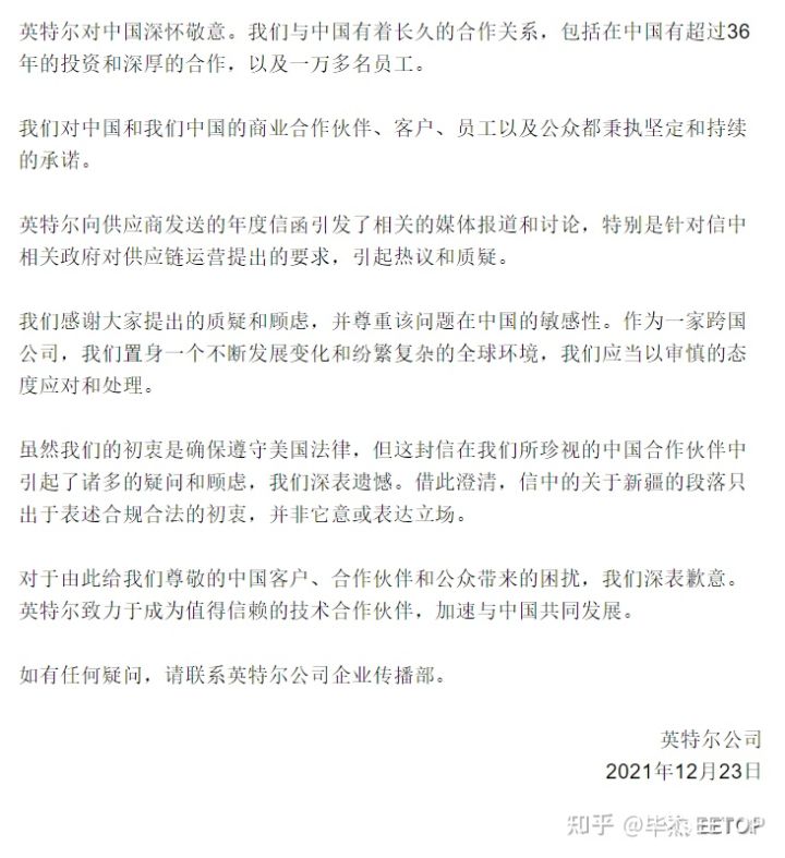 虽然从经济意义来说,影响应该不大,英特尔的产品供应链与新疆关系本就不多。几乎可以断定,声明不会对英特尔在中国的生产带来影响,甚至是否会进行认真的检查都不一定。不过很多网友表示,英特尔这类企业的声明还是"政治表态",这比经济伤害还要大。国内包括王俊凯在内的一些明星第一时间也解除了与英特尔品牌一切合作关系。对此,英特尔今天上午发布了官方声明,表示:信中的关于新疆的段落只出于表述合规合法的初衷,并非它意或表达立场。对于由此给我们尊敬的中国客户、合作伙伴和公众带来的困扰,我们深表歉意。英特尔致力于成为值得信赖的技术合作伙伴,加速与中国共同发展。
