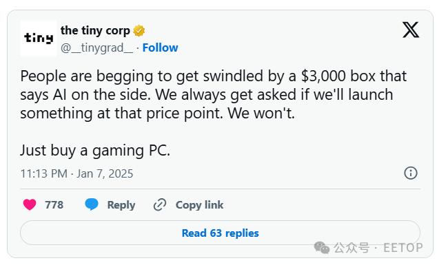 时间快进到2025年的CES,Tiny Corp的强硬态度丝毫未减。“人们乞求被一个侧面写着AI的3000美元盒子骗走钱。总有人问我们会不会以这个价格推出产品。我们不会,”Tiny Corp抱怨道,并建议其随意关注的粉丝们“直接买一台游戏电脑”。
