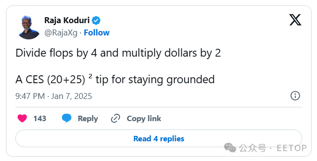 Raja对Project Digits的拆解可以用一种带有一点讽刺意味的温和极客玩笑来形容。这位图形芯片设计界的标志性人物发帖称:“把运算次数除以4,把美元乘以2。这是CES (20+25)²的接地气小贴士。” 以此讽刺黄仁勋及英伟达团队。