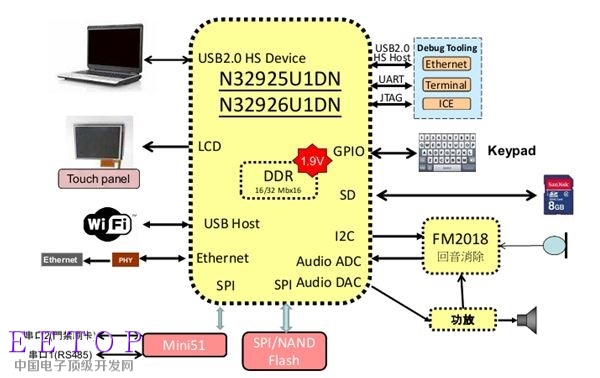 大联大品佳代理的Nuvoton的N32926 方案基于ARM9内核,可以支持1024*768分辨率@25fps,可以支持两路CMOS输入,支持硬件视频、音频的编解码,支持通过SDIO / USB连接WIFI Dongle。同时在TQFP封装中内置DDR2,易于客户生产加工并提升良品率。