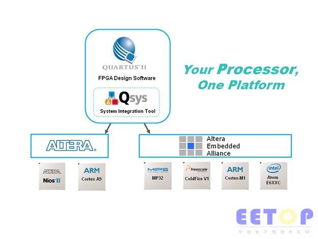 MP32处理器设计用于和Altera的Qsys系统集成工具一同使用。系统规划人员将MP32处理器以及Altera及其全球IP合作伙伴提供的嵌入式、网络、视频和数字信号处理IP结合起来使用,能够迅速方便的开发复杂但非常灵活的解决方案,同时突出自己产品的优势。可以在www.altera.com.cn/mp32video上观看重点介绍Qsys系统集成平台MP32处理器设计流程的视频。